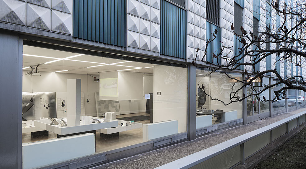 Hinter einer streng gerasterten Fassade, in Weiß und Türkis gehalten, verbirgt sich ein Nutzungsmix aus Wohnungen, Hotel, Büros und halböffentlichen Erholungsräumen. Die Innenräume sowie der im Erdgeschoss gelegene halfway Projektraum orientieren sich zu dem privaten, aber öffentlich zugänglichen Grünraum. Die darin angelegte urbane Utopie spiegelt sich auch in den kinematografisch gestalteten raumhohen Fensteröffnungen wider, die, ähnlich einem begehbaren Schaufenster, mit dem Moment des Voyeuristischen spielen, aber gleichzeitig dessen Struktur offenlegen.
