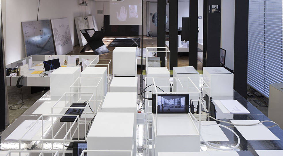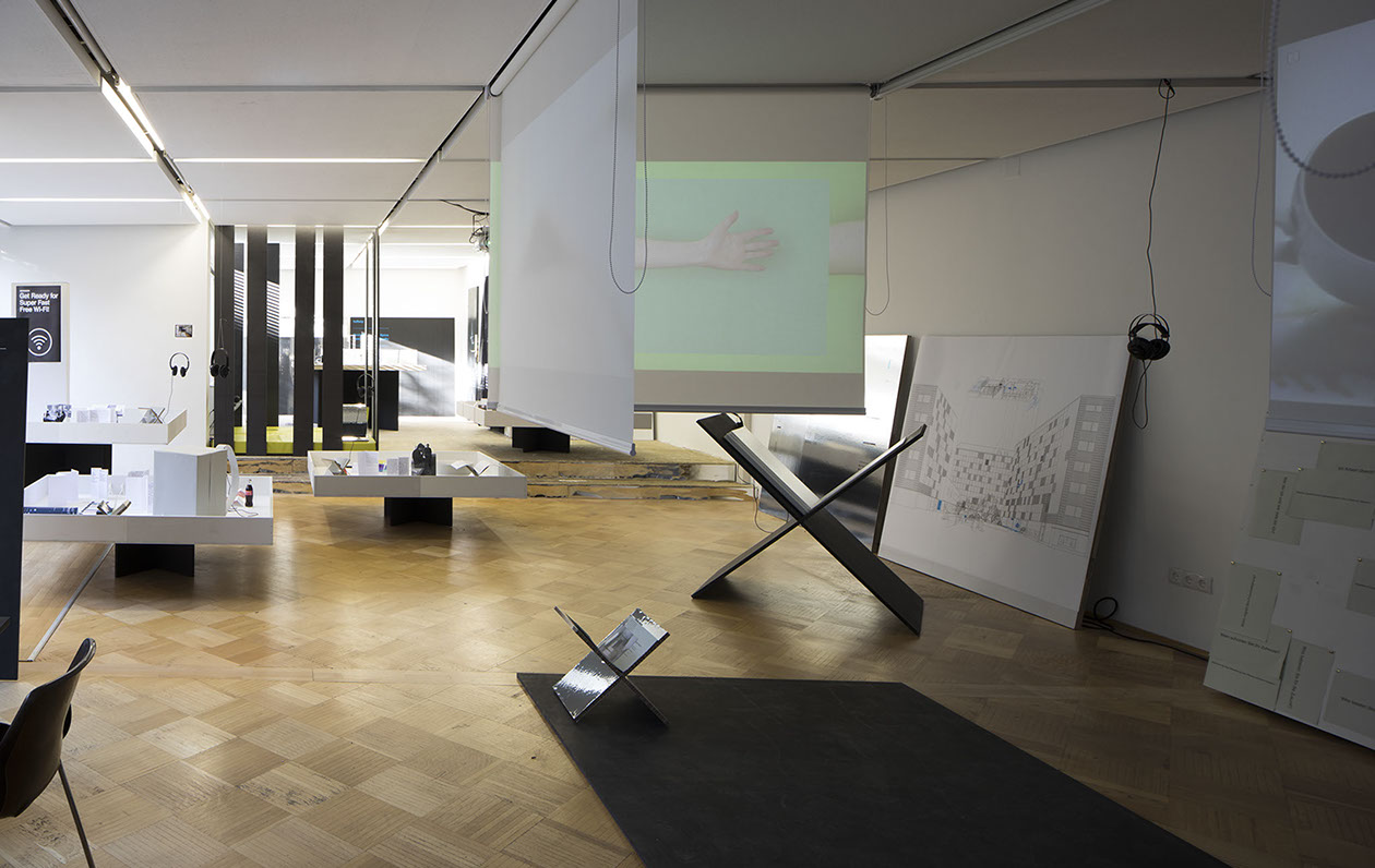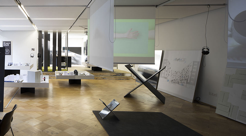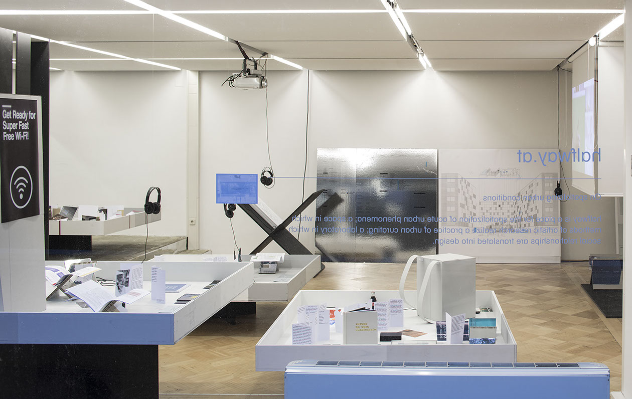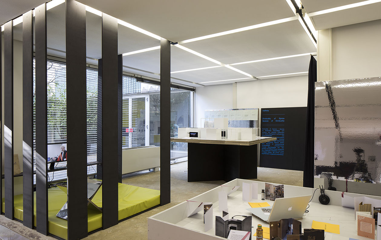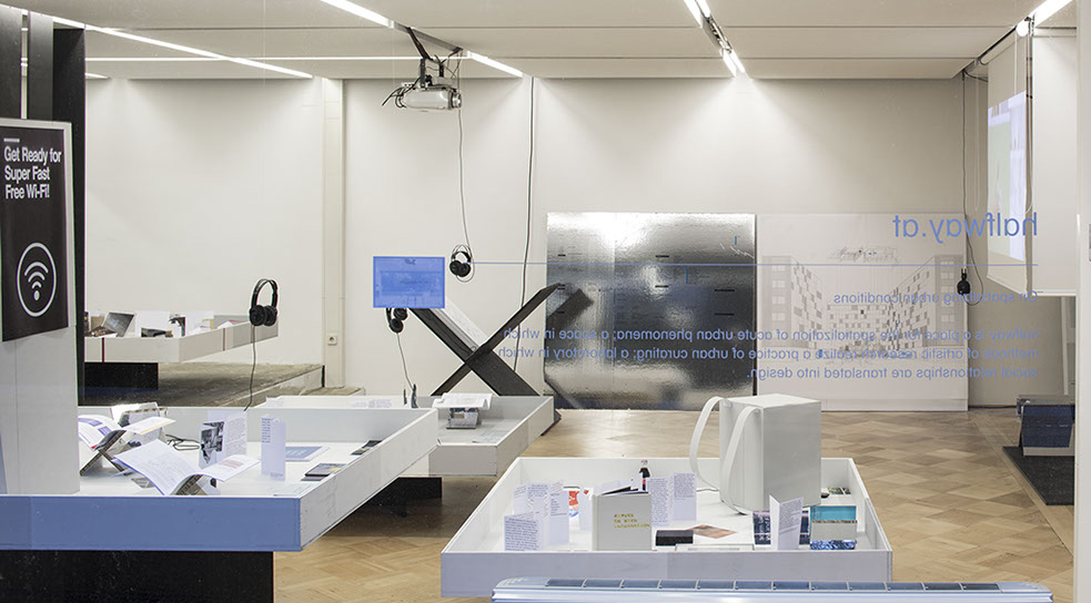 Für halfway wurde von Christina Nägele, Heidi Pretterhofer, Christian Teckert und Linda Lackner ein räumliches Setting und Display erarbeitet, das als Forschungswerkzeug fungierte und eine entscheidende Zone der Interaktion, Kommunikation und Performanz bildete. Die Elemente im Raum wurden allesamt aus vorgefundenen Parametern der Architektur des Raums übernommen und transformiert. Der Komplex, in dem halfway lokalisiert war, verkörpert eine Idee von Räumlichkeit, in der genau jene gesellschaftliche Formation in den Grundzügen ihr Bild annimmt, die wir untersuchen: Die auf immaterielle Arbeit setzende Ökonomie des kognitiven Kapitalismus, an deren Beginn nicht zufällig die Themen Raster, Kybernetik und Modulation entscheidende Momente der Gestaltung waren.