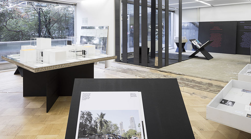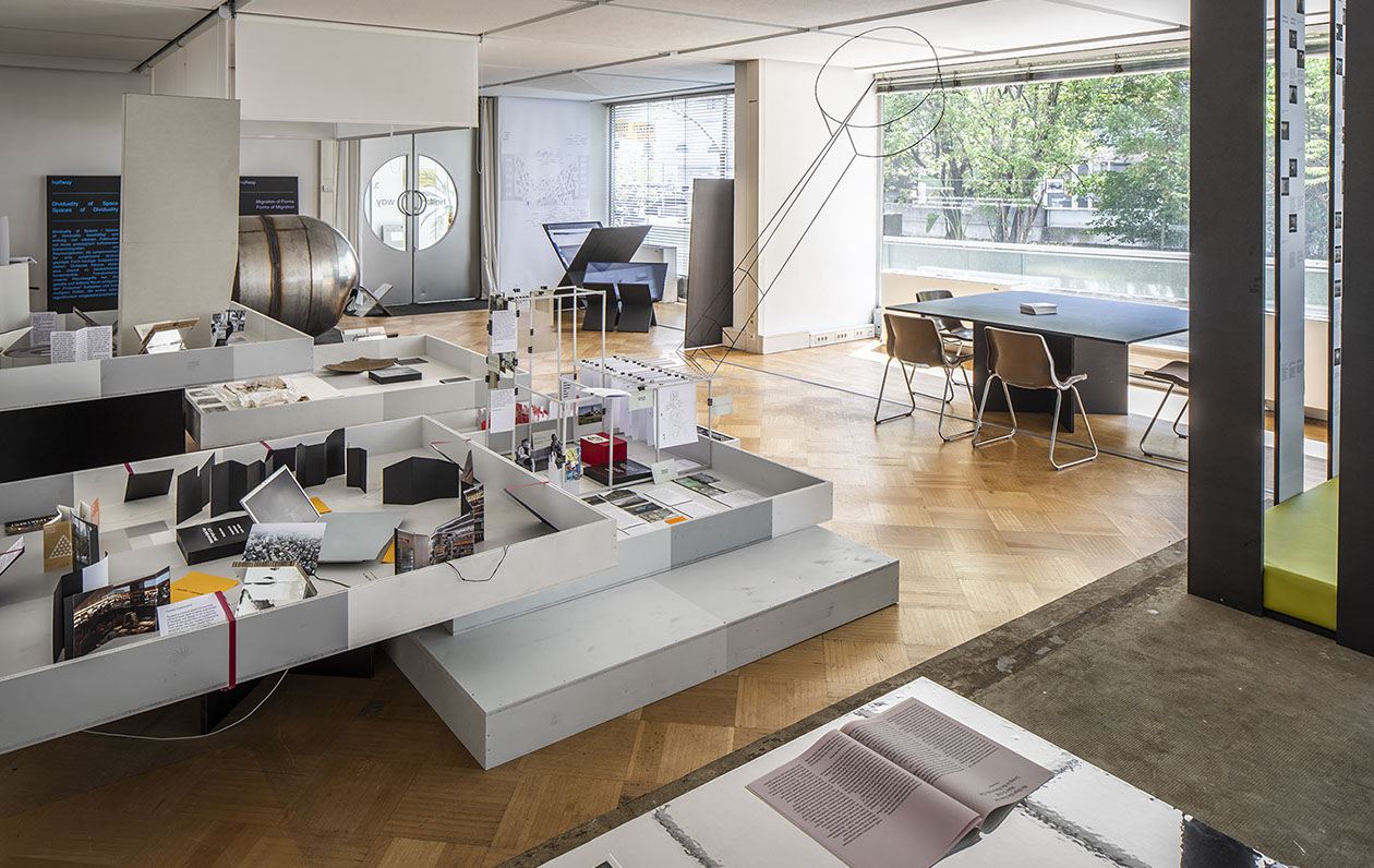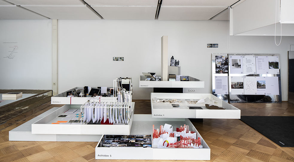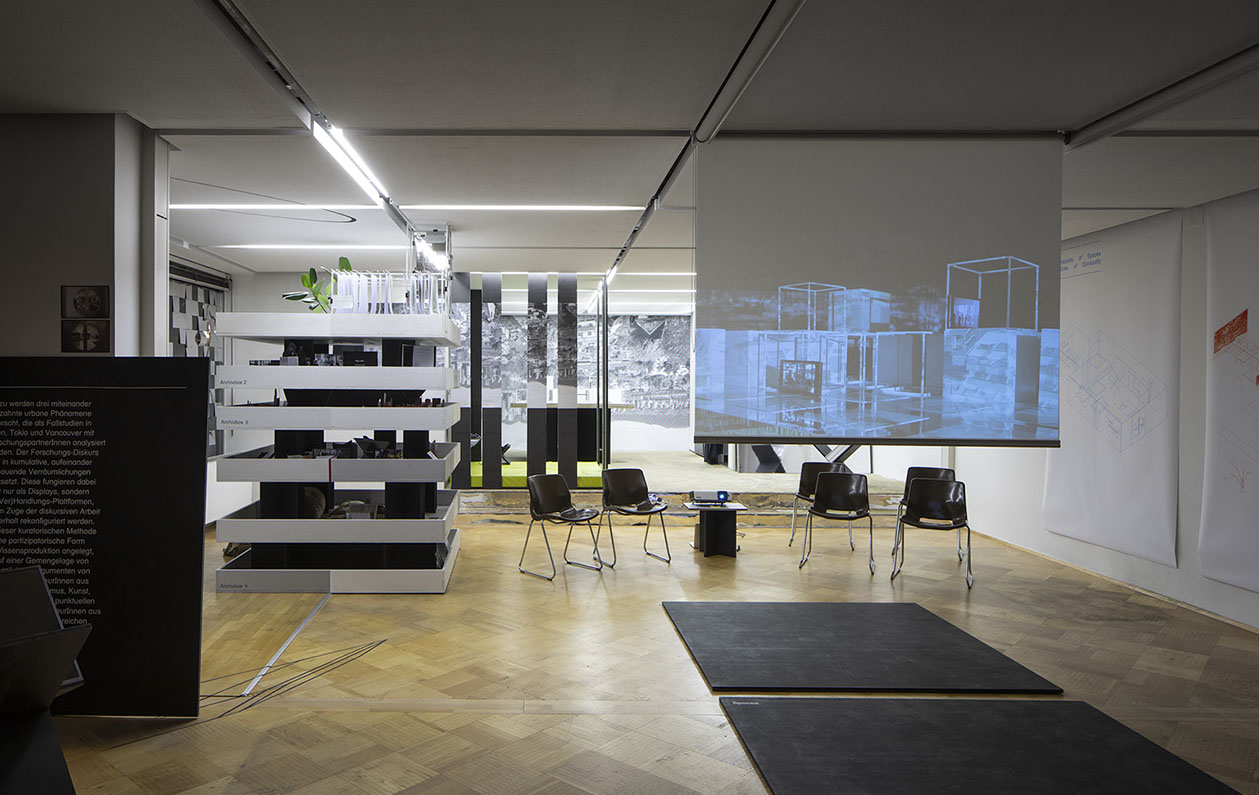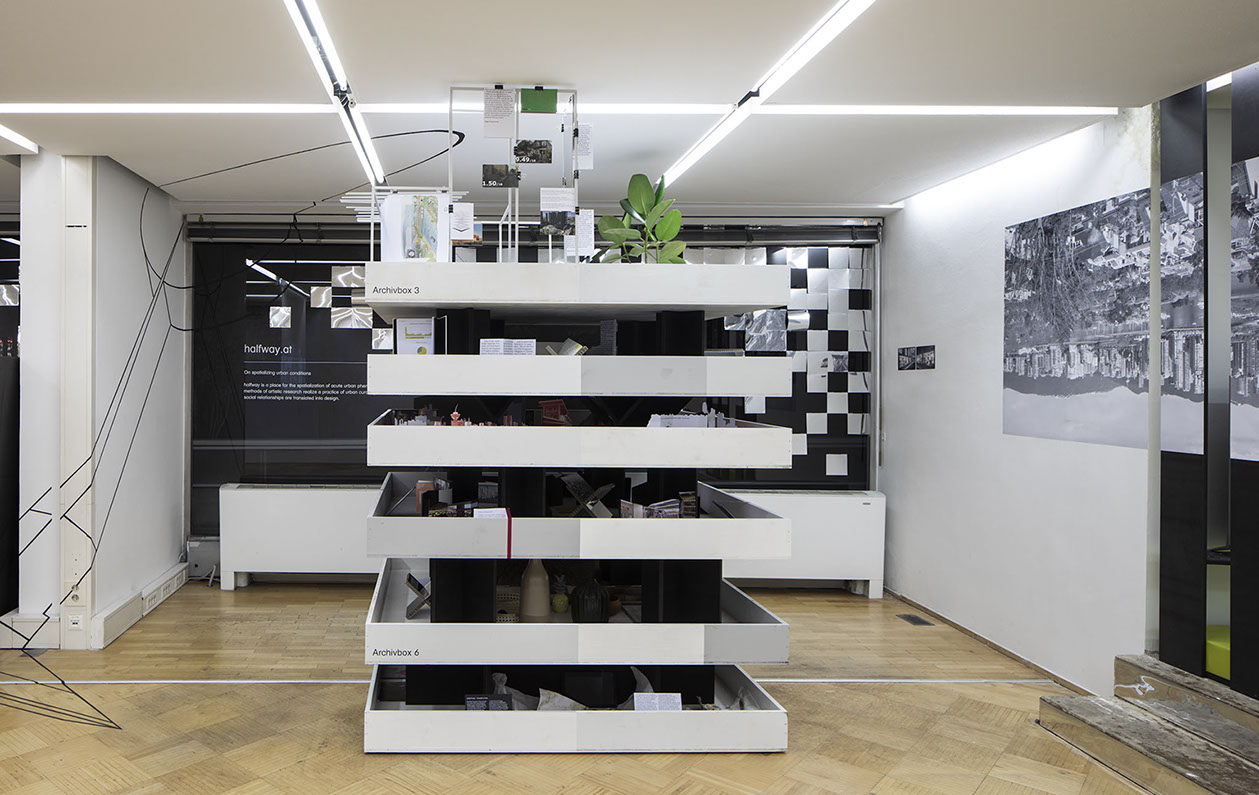 Aus dem Raster der Deckenelemente in halfway wurde eine Reihe von Displays entwickelt, die als Trägerfiguren für die Inhalte unserer Verräumlichungen stehen. Mit Spiegelfolie überzogene Kartonplatten, raumlange Rollos als Raumteiler oder Projektionsflächen, schwarz gefärbte MDF-Platten als Textträger sowie mit Farbfeldern markierte Holzkisten als Archivboxen stellen das primäre Arbeitsmaterial dar, mit dem sukzessive an räumlichen Settings gearbeitet wurde. Diese wiederum sind als Kommunikationswerkzeuge zu verstehen, die als Einladung zum Diskurs und zur Vermittlung dienten.