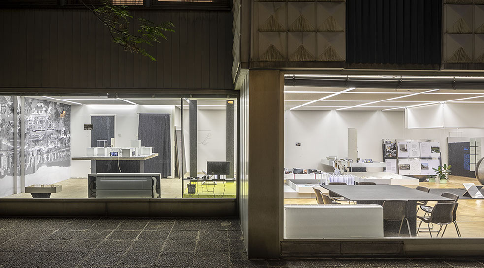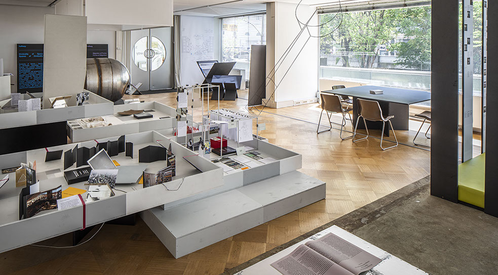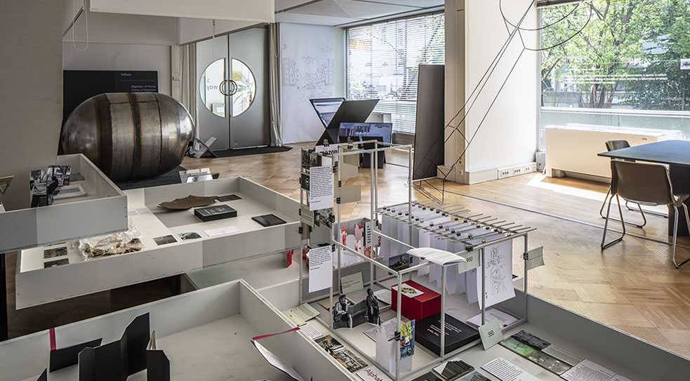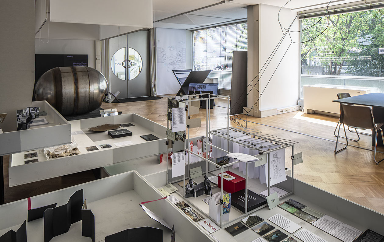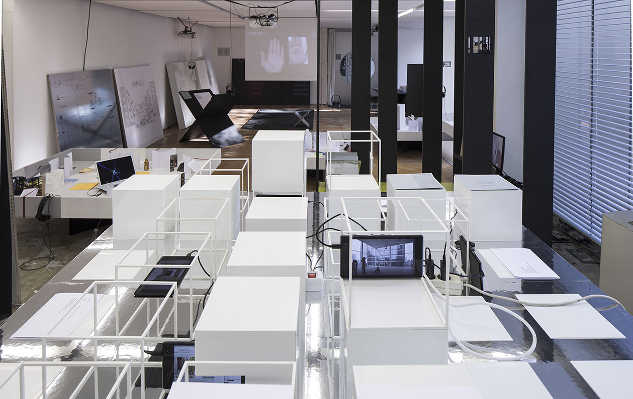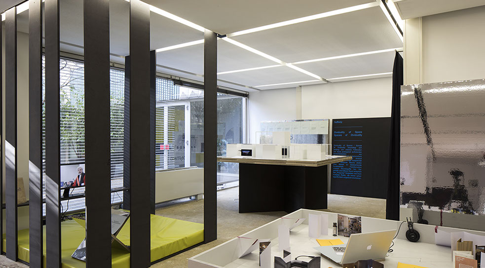 Innerhalb des modularen Displaysystems wurden zwei räumliche Fixpunkte definiert, die aus den inhaltlichen Fragestellungen abgeleitet wurden. So sind zwei räumliche Settings als Zitate bzw. Derivate dividualer Räume konzipiert, die gleichzeitig auch Werkzeuge der Kommunikation und Referenz sind.
