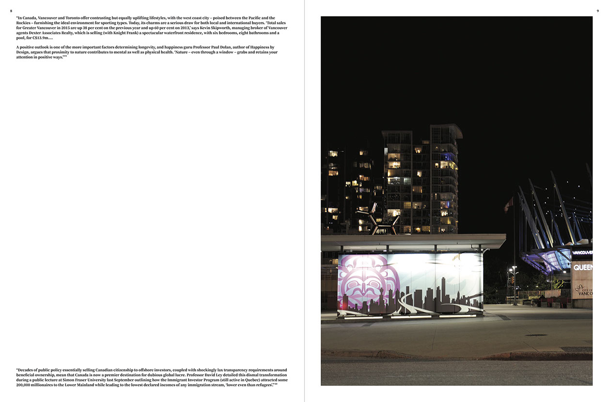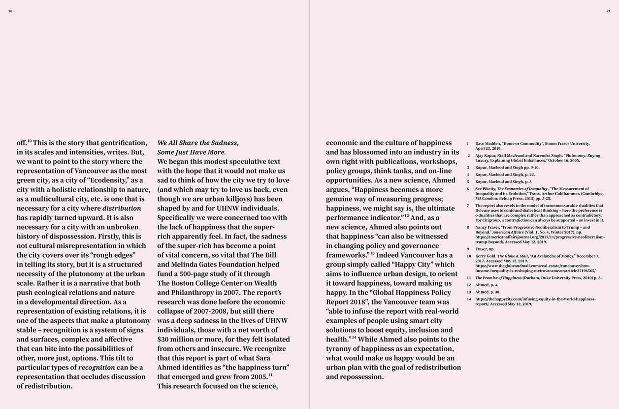 We are looking for the ways the ultra-high net worth individuals (UHNW) and the economy associated with them (the plutonomy) has shaped a city that we live in—Vancouver. It could make us sad because we have to look at the lives and spaces of the UHNW and that can be, well, depressing. In fact, the sadness of the super rich themselves has become a point of vital concern, so vital that The Bill and Melinda Gates Foundation helped fund a 500-page study of it through The Boston College Center on Wealth and Philanthropy. The research was done before the economic collapse of 2007–2008, and even in that moment of capitalist euphoria there was a deep sadness in the lives of UHNW, those with a net worth of $30 million or more, for they felt isolated from others and insecure. This made us think: How have particular cities become the sites for the super rich? Does it have to do with their sadness as well as supplying a place to ground their wealth through real-estate? But, what other urban qualities and qualities of life might ease this particular sadness—multiculturalism, safety, good restaurants, great food trucks, easy access to nature, excellent money laundering opportunities? We know the ultra-high net worth individuals are sad and worried because they feel isolated, distanced from people and places. That is their sad geography. They are geographically bound and globally networked. While they reterritorialize a city, they unterritorialize themselves—and that is where the sadness starts. But does that also make a city sad?