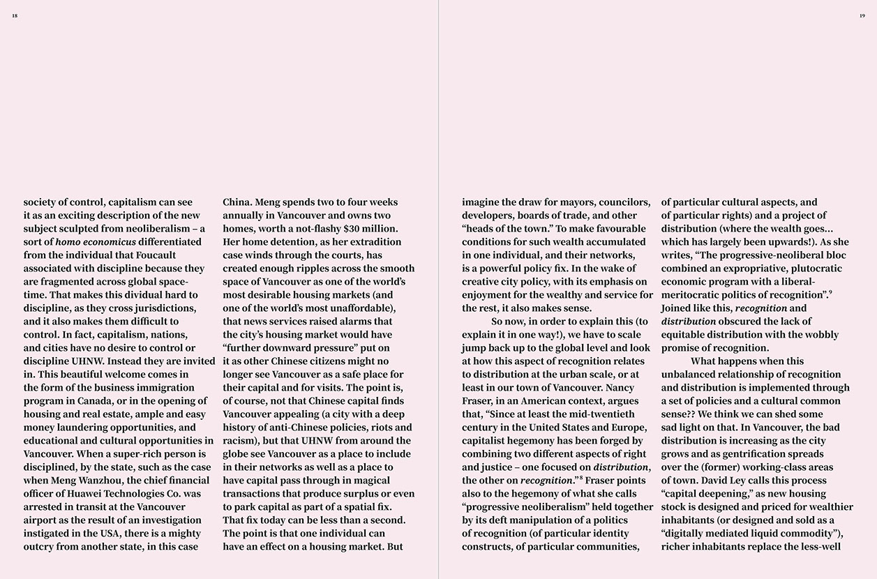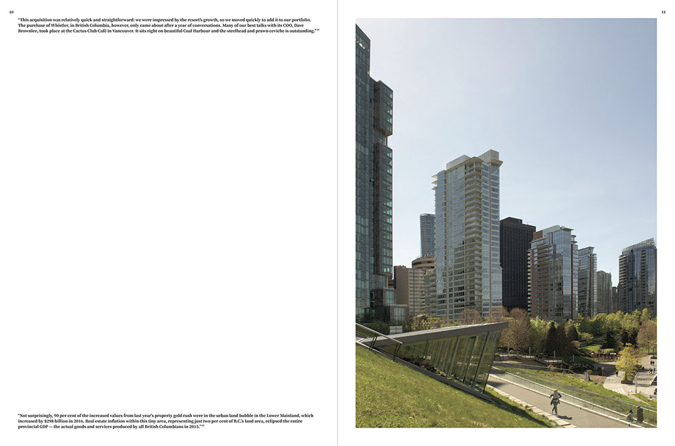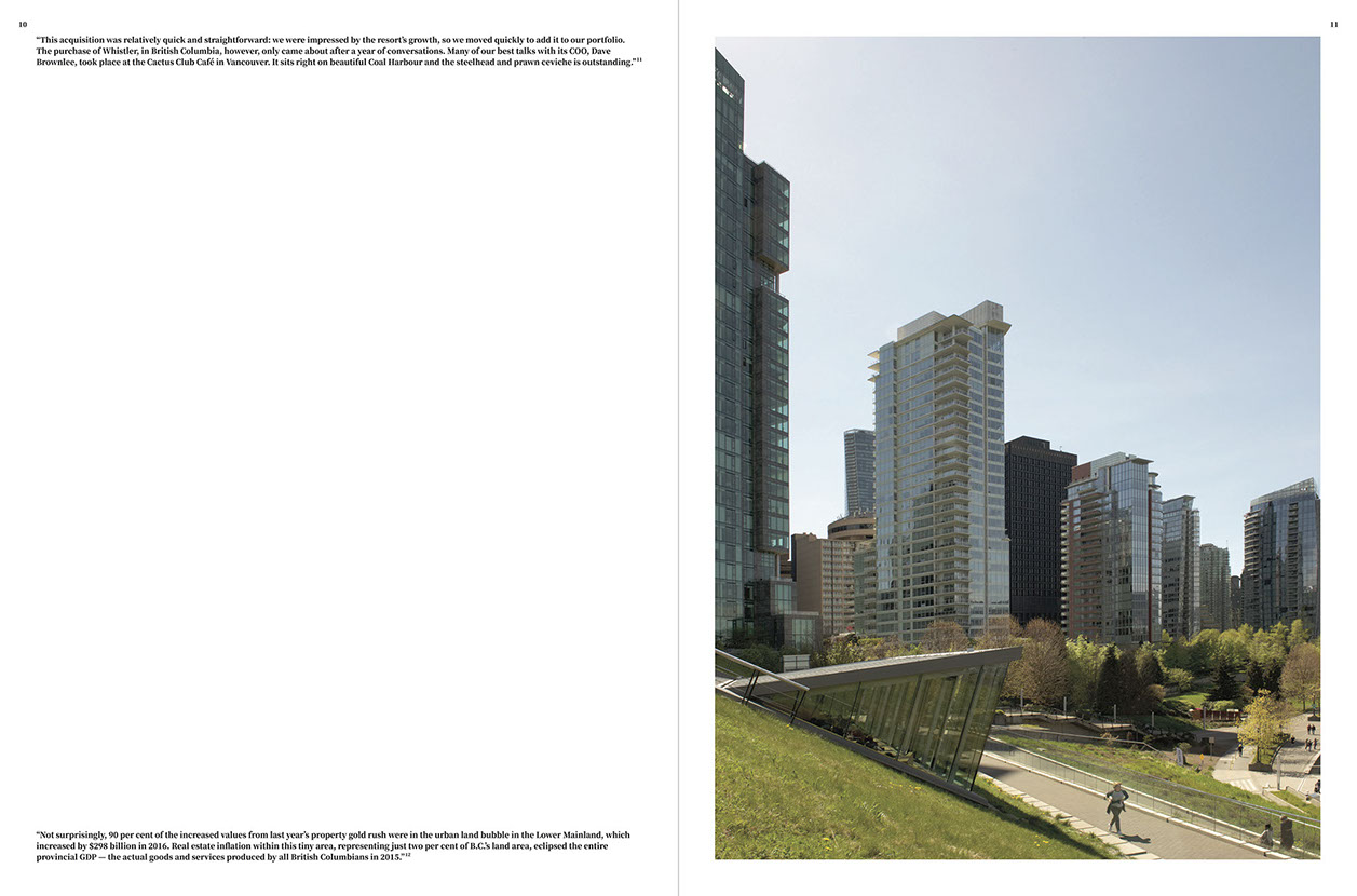 Departing from an analysis of the urban impacts of a globalized economy that uses architecture as assets and speculates with its temporalized value, halfway and our research partners Urban Subjects initiated a discourse on the question of property in relation to urban space. The city of Vancouver was chosen as a case study because rarely have the effects of private investment capital ever been translated so concretely, spatially and graphically, in the urban fabric. Generating an image of the city via the skyline, however, only represents the surface of an urban model in which the radical redefinition of the borders of a city archipelago become tangible.