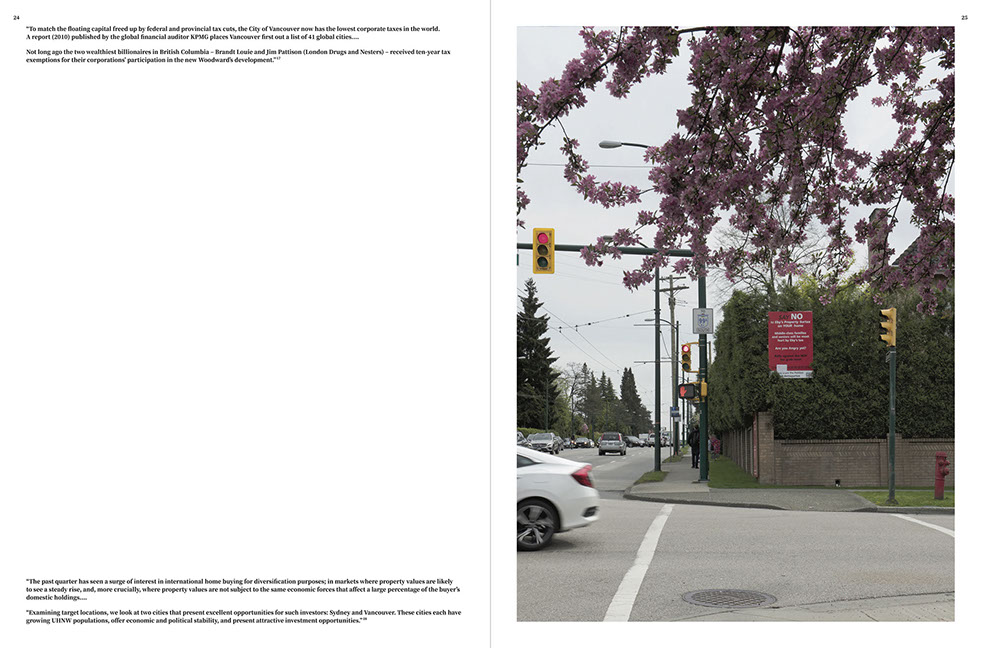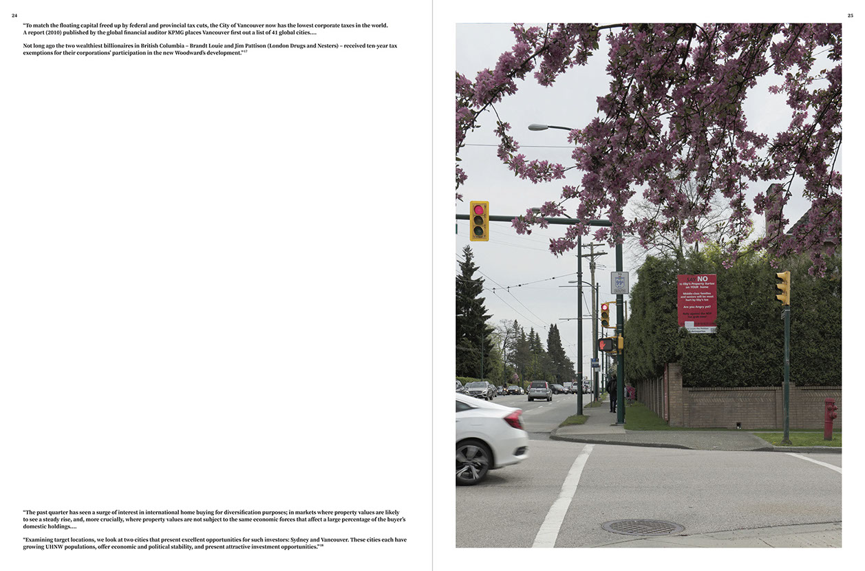 The exhibition titled We Hope this Does Not Make Us Sad by Urban Subjects in the framework of the research project halfway pointed to an inner state, a sadness, that the “plutocracy”—meaning the rich—who are successively appropriating a city like Vancouver, is equally as familiar with as those who are facing these processes with concern and critique, and whose only hope left is that this development will not make them sad. On the part of the rich, it’s the sadness that they will lose the city they want to appropriate precisely because they are buying it up and thereby ruining the life on site—a tragicomical winner-loser logic not dissimilar to the myth of King Midas: The city transforms analogously from a money pit to a gold mine and ultimately into a grave made out of gold. And those who hope not to become sad only sense the weight of the money they must evade in order not to be buried by the burden of the prosperity of others—but even therein resides nothing but the hope for a loan, a rented hope with rising interest rates. On different levels the exhibition traced the growth curves of this guiltless guilt of those who hope… despite and in spite of the sadness, to spite a sense of resistance. With this feeling in the stomach, Urban Subjects wander the streets of Vancouver, collecting data and images that document the successive process of appropriation and expropriation, a scandal one hardly notices on the street because it’s more speculative than spectacular in nature.