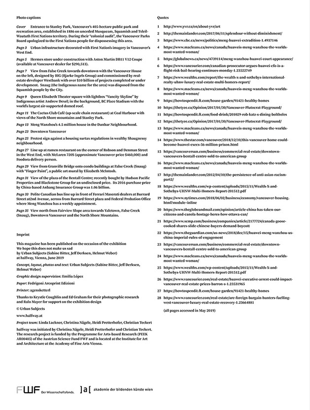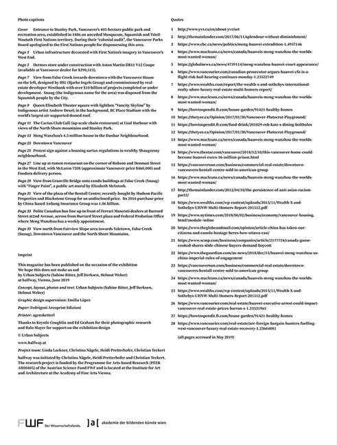 For halfway, our research partners Urban Subjects examined a specific form of dividualization in an economy of access. Taking the Canadian city of Vancouver as example, they developed the intervention We Hope this Does Not Make Us Sad, which unfolds a discourse about the relationship of property in connection with urban space. Vancouver served as a testbed for visualizing complex, barely visible relationships between global economy and spaces of everyday life. In an economy of image production Vancouver functions as a stageset upon which the impacts of private investment capital are spatially translated and take effect in the urban fabric. On site, however, they are elusive and hard to grasp. The skyline serves as an image of a city, in which the redefined borders of the urban archipelago are extreme and follow, first and foremost, real estate values and prices.