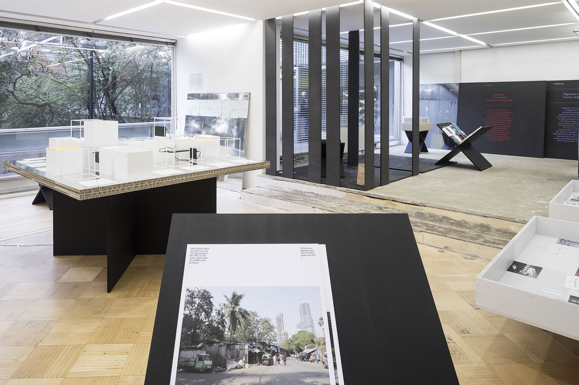Aus dem Raster der Deckenelemente in halfway wurde eine Reihe von Displays entwickelt, die als Trägerfiguren für die Inhalte unserer Verräumlichungen stehen. Mit Spiegelfolie überzogene Kartonplatten, raumlange Rollos als Raumteiler oder Projektionsflächen, schwarz gefärbte MDF-Platten als Textträger sowie mit Farbfeldern markierte Holzkisten als Archivboxen stellen das primäre Arbeitsmaterial dar, mit dem sukzessive an räumlichen Settings gearbeitet wurde. Diese wiederum sind als Kommunikationswerkzeuge zu verstehen, die als Einladung zum Diskurs und zur Vermittlung dienten.