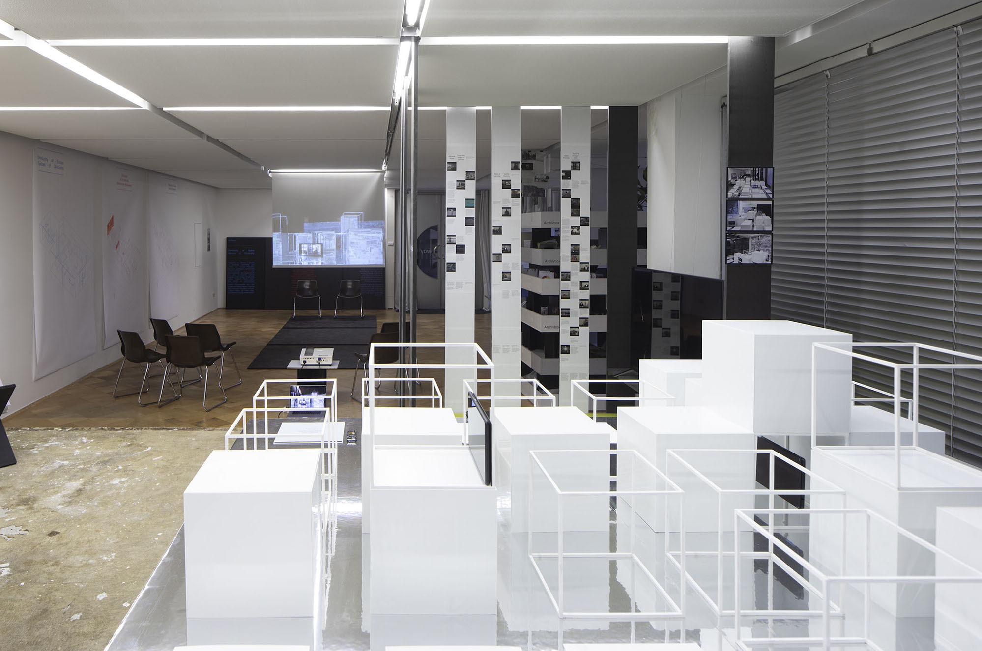 Innerhalb des modularen Displaysystems wurden zwei räumliche Fixpunkte definiert, die aus den inhaltlichen Fragestellungen abgeleitet wurden. So sind zwei räumliche Settings als Zitate bzw. Derivate dividualer Räume konzipiert, die gleichzeitig auch Werkzeuge der Kommunikation und Referenz sind.