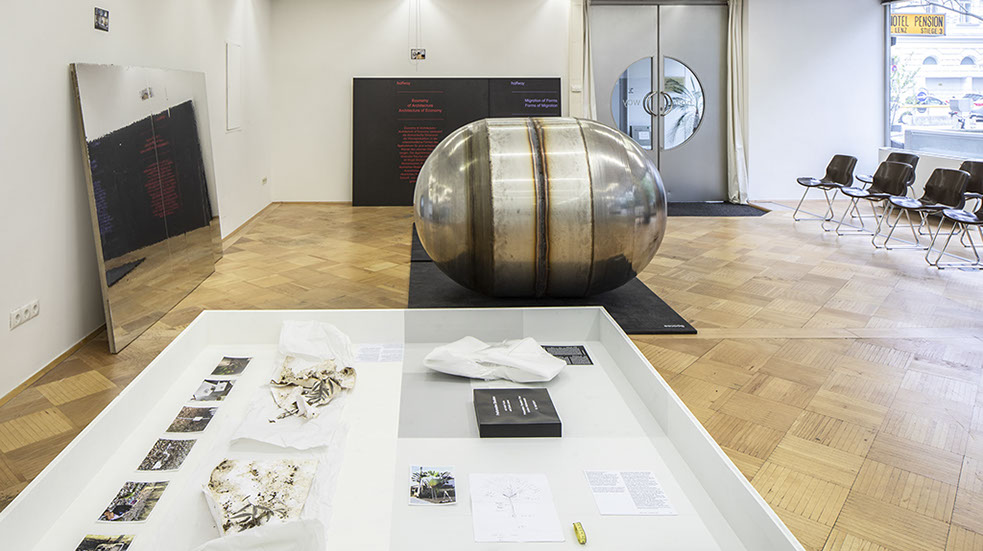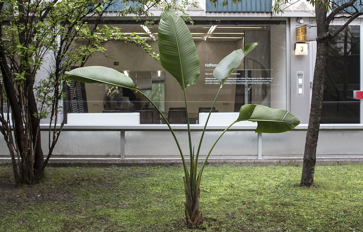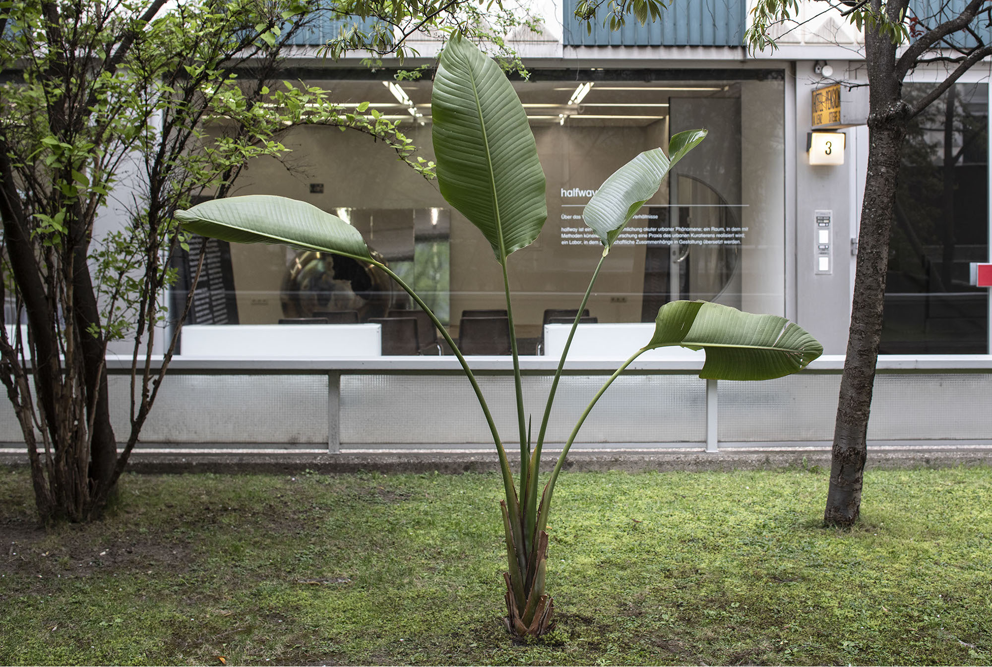 The work Traveller’s Tree by Anita Fuchs linked and deformed three different plants and their habitats: the overly cultivated urban grove of the halfway building complex, a Traveller’s Tree from a coastal region of Mexico, and a woodland outdoor workplace on the Austro-Hungarian border. In this idiosyncratic overlap the plants themselves became protagonists that spoke of fashions, aesthetics, and political relations.