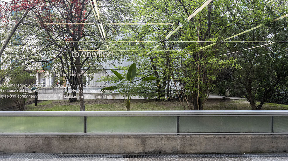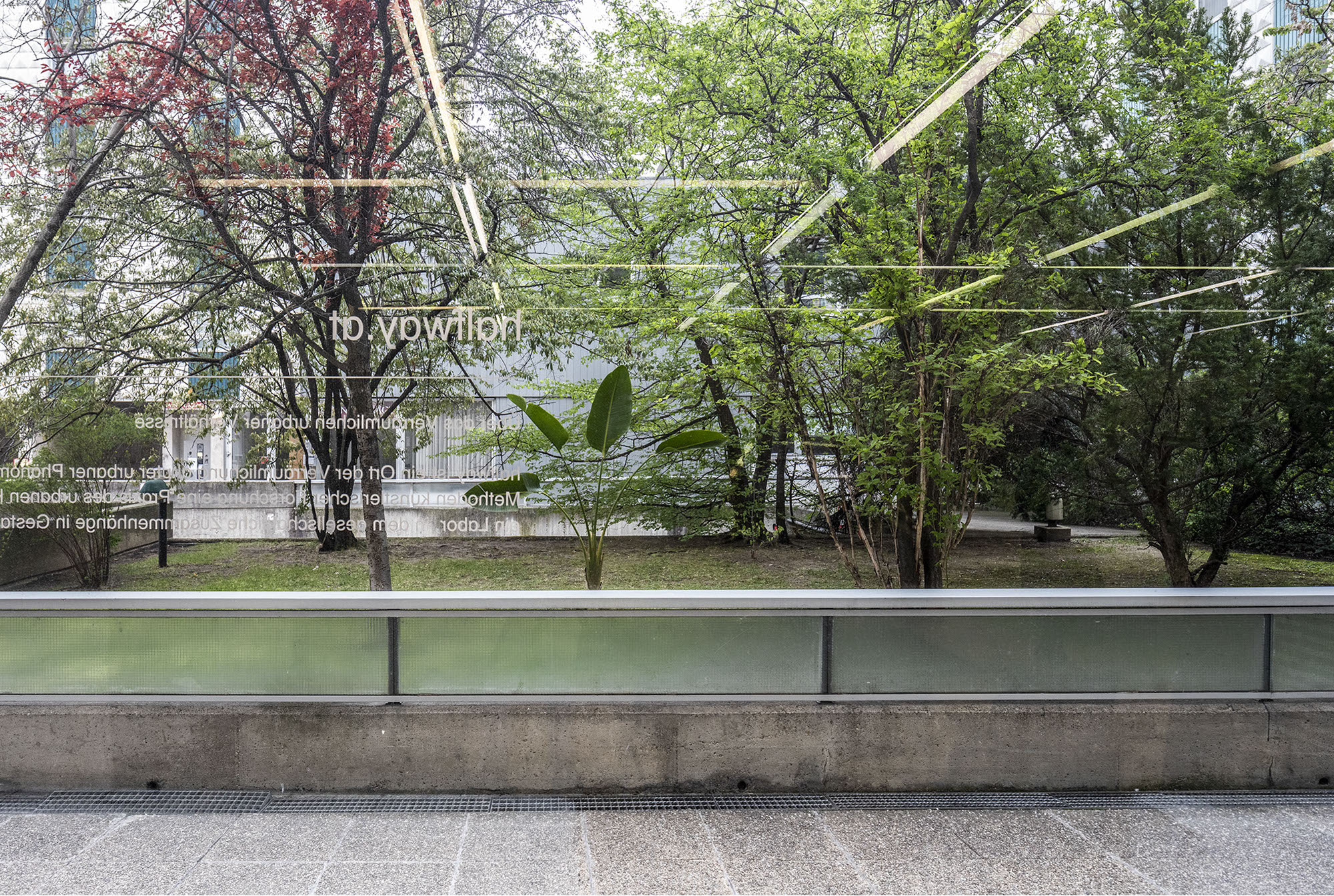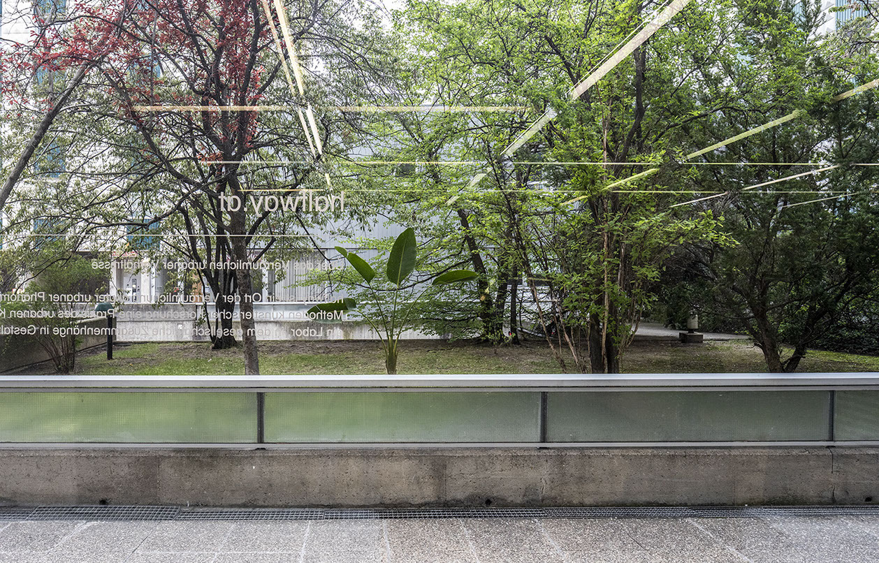 Rauminstallation, doppelseitige Spiegelfolie auf Glasscheibe