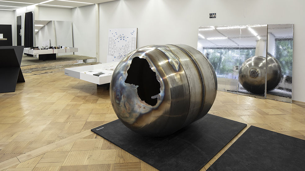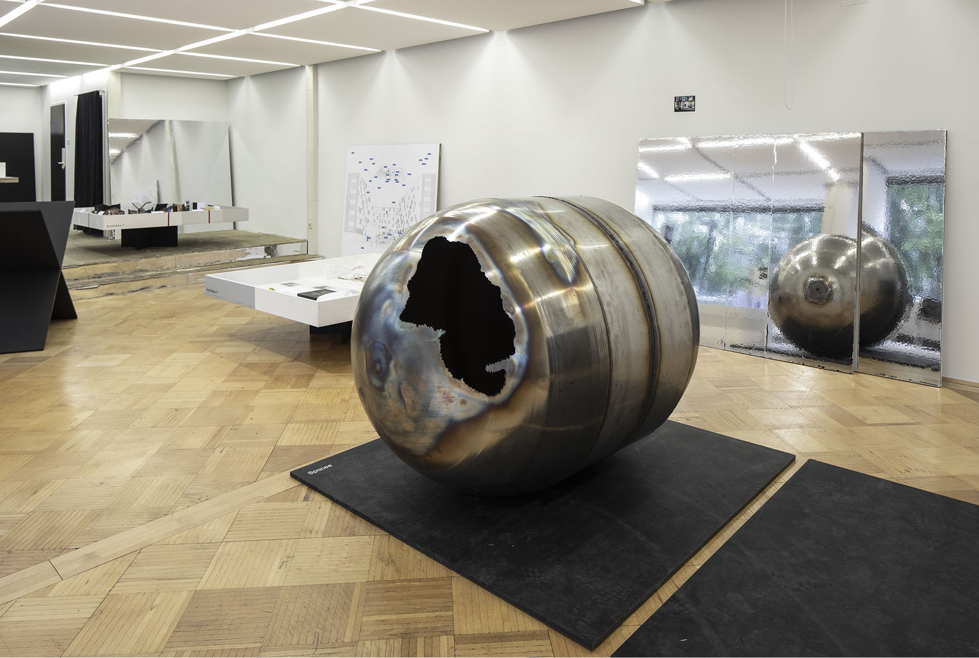 Sonia Leimers Skulptur Space-Junk, die Teil des räumlichen Settings in halfway war, basiert auf dem Duplikat eins Weltraumschrotts, der 2001 in Saudi-Arabien aufgeschlagenen war. In diesem unkontrollierten Zusammenprall von Materie wird die Struktur der geopolitischen Machtverhältnisse genauso sichtbar wie das paradoxe physische Gewicht der globalen Infrastrukturen zur Herstellung der scheinbar so reibungslosen und immateriellen Netzwerke unserer digitalen Umgebungen.